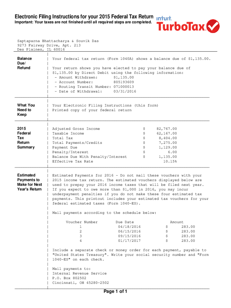 Electronic Filing Instructions for your 2015 Federal Tax Return Important: Your taxes are not finished until all required steps are completed. Santayana Bhattacharya & Souk Was 9273 Fairway Drive,