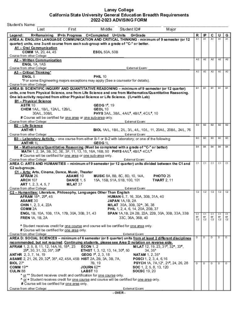 Lana College California State University General Education Breadth Requirements 20222023 ADVISING FORMStudent\'s Name: ___ ___ ___ Last First Middle Student ID# Major Legend: Remaining Spin Progress