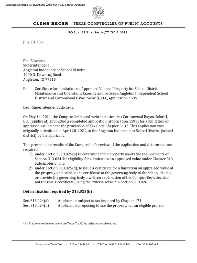 DocuSign Envelope ID: 8E0A5B022A894C41B17448A2FA958D89July 28, 2021Phil Edwards Superintendent Angleton Independent School District 1900 N. Downing Road Angleton, TX 77515 Re:Certificate for Limitation