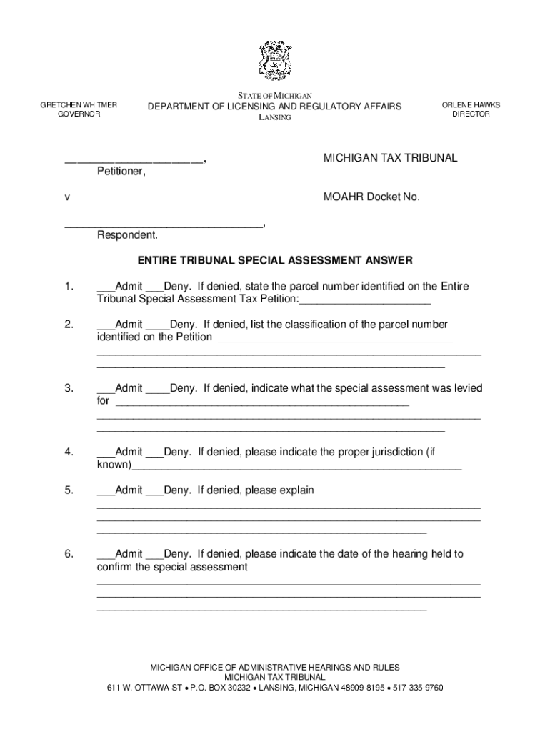 STATE OF MICHIGAN DEPARTMENT OF LICENSING AND REGULATORY AFFAIRS LANSINGGRETCHEN WHITMER GOVERNOR___, ARLENE HAWKS DIRECTORMICHIGAN TAX TRIBUNALPetitioner, mother Docket No.___, Respondent. ENTIRE