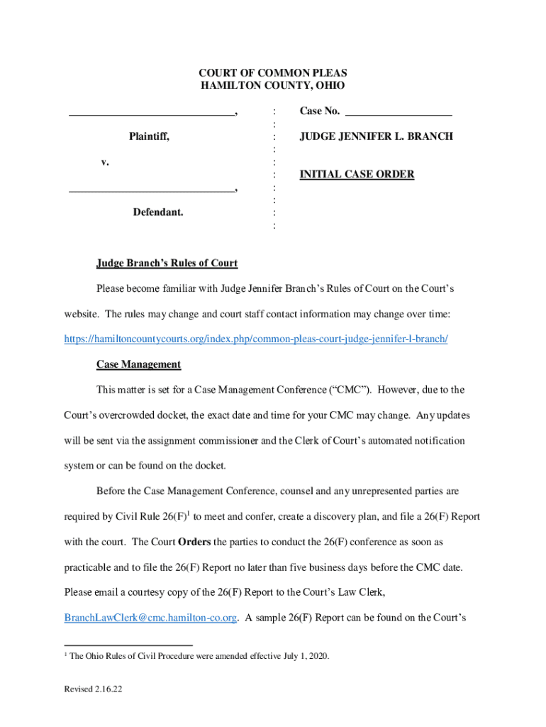 COURT OF COMMON PLEAS HAMILTON COUNTY, OHIO ___, Plaintiff, v. ___, Defendant.: : : : : : : : : :Case No. ___ JUDGE JENNIFER L. BRANCHINITIAL CASE Prejudge Branch's Rules of Court Please become familiar