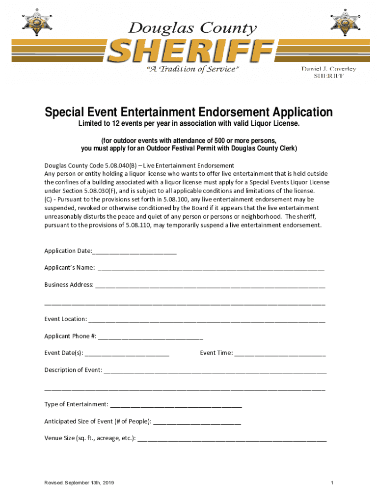 Special Event Entertainment Endorsement Application Limited to 12 events per year in association with valid Liquor License. (for outdoor events with attendance of 500 or more persons, you must apply