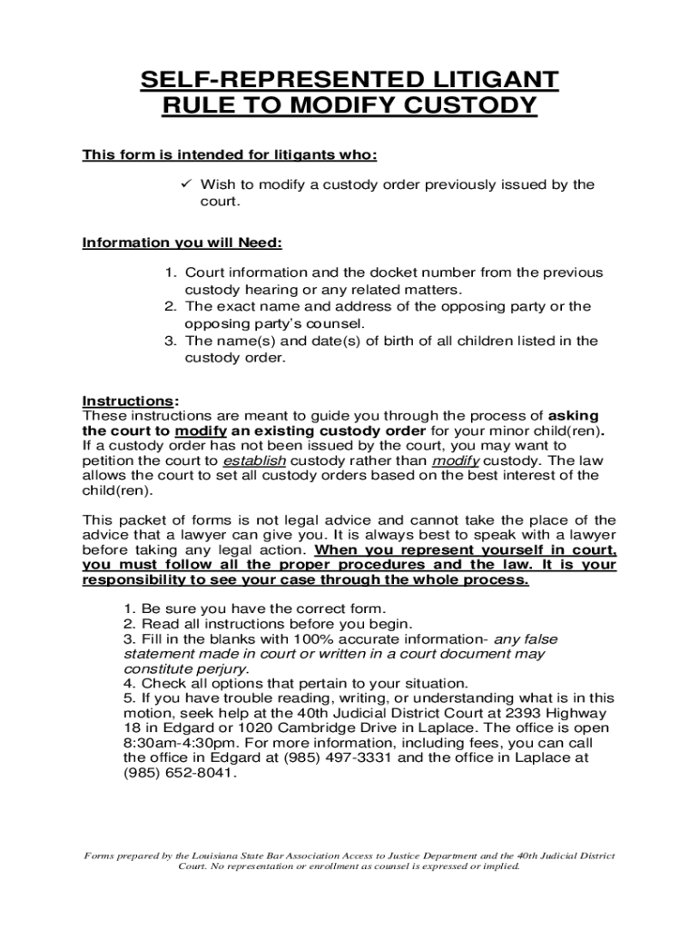 SELFREPRESENTED LITIGANT RULE TO MODIFY CUSTODY This form is intended for litigants who: Wish to modify a custody order previously issued by the court. Information you will Need: 1. Court information