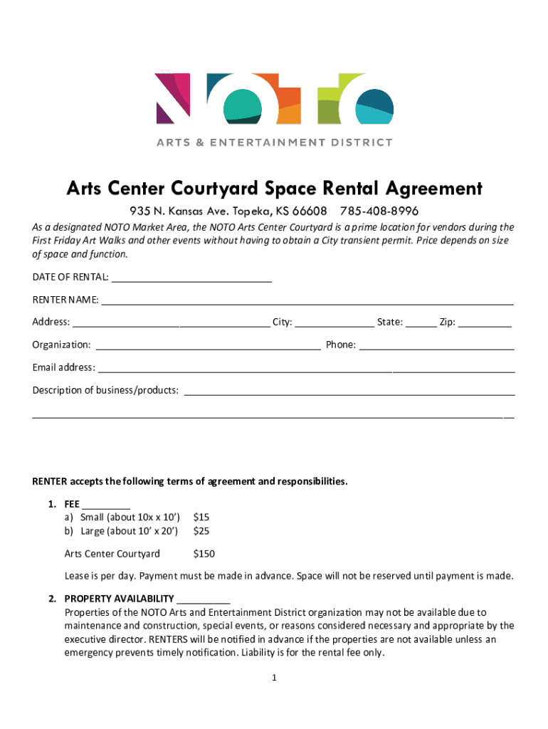 Arts Center Courtyard Space Rental Agreement 935 N. Kansas Ave. Topeka, KS 666087854088996As a designated NOT Market Area, the NOT Arts Center Courtyard is a prime location for vendors during the