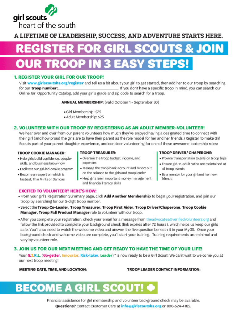 A LIFETIME OF LEADERSHIP, SUCCESS, AND ADVENTURE STARTS HERE.REGISTER FOR GIRL SCOUTS & JOIN OUR TROOP IN 3 EASY STEPS! 1. REGISTER YOUR GIRL FOR OUR TROOP! Visit www.girlscoutshs.org/register and