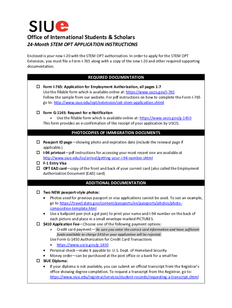Office of International Students & Scholars 24Month STEM OPT APPLICATION INSTRUCTIONS Enclosed is your new I20 with the STEM OPT authorization. In order to apply for the STEM OPT Extension, you must