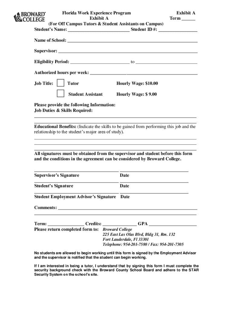 Florida Work Experience Program Exhibit A Term ___ (For Off Campus Tutors & Student Assistants on Campus) Students Name: ___ Student ID #: ___ Name of School: ___ Supervisor: ___ Eligibility Period: