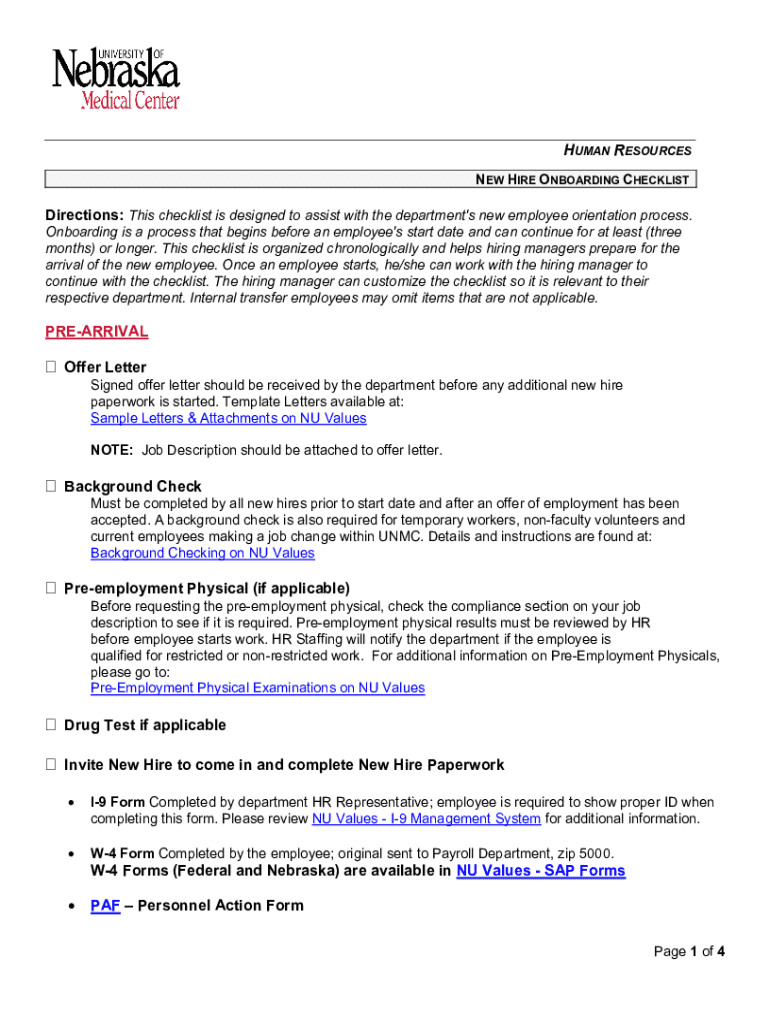 HUMAN RESOURCES NEW HIRE ONBOARDING CHECKLISTDirections: This checklist is designed to assist with the department\'s new employee orientation process. Onboarding is a process that begins before an