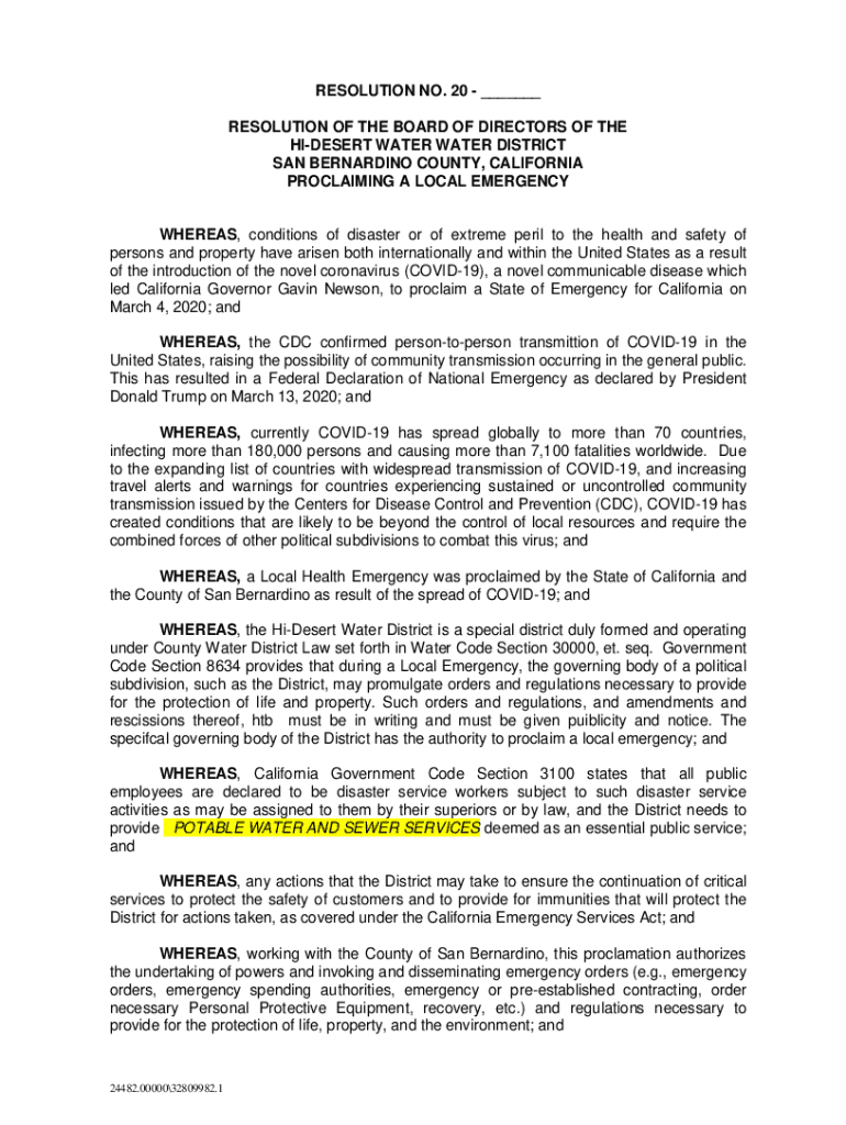 RESOLUTION NO. 20 ___ RESOLUTION OF THE BOARD OF DIRECTORS OF THE HIDES ERT WATER DISTRICT SAN BERNARDINO COUNTY, CALIFORNIA PROCLAIMING A LOCAL EMERGENCYWHEREAS, conditions of disaster or of extreme