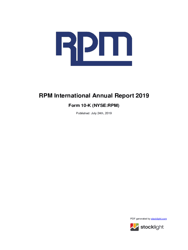 RPM International Annual Report 2019 Form 10K (NYSE:RPM) Published: July 24th, 2019PDF generated by stock light. Counted STATES SECURITIES AND EXCHANGE COMMISSION Washington, D. C. 20549Form 10K ANNUAL