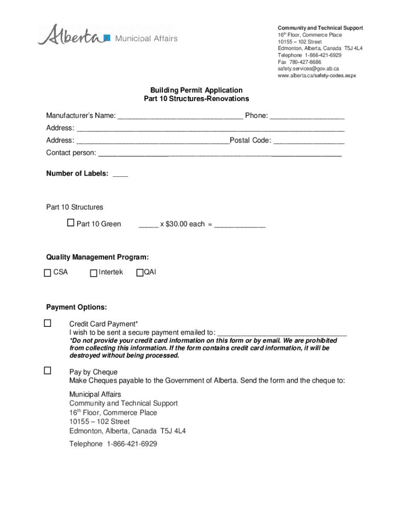 Community and Technical Support 16th Floor, Commerce Place 10155 102 Street Edmonton, Alberta, Canada T5J 4L4 Telephone 18664216929 Fax 7804278686 safety.services@gov.ab.ca www.alberta.ca/safetycodes.aspxBuilding