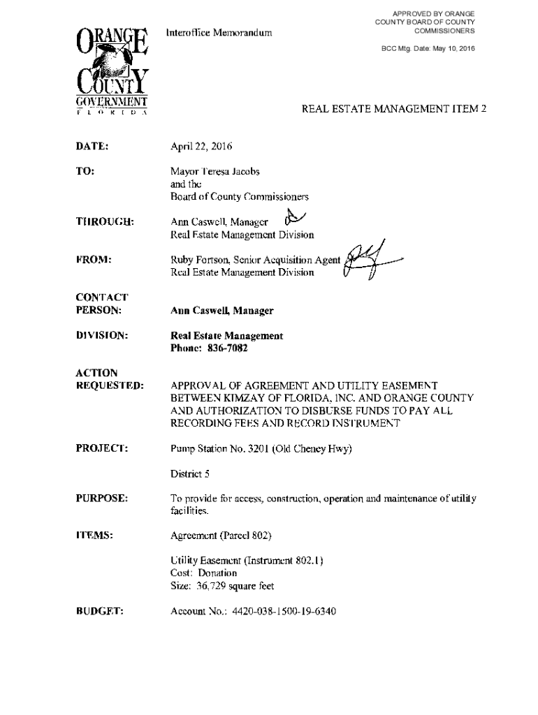 APPROVED BY ORANGE COUNTY BOARD OF COUNTY COMMISSIONERSInteroffice Memorandum BCC Mtg. Date: May 10, 2016GOVERNMENTREAL ESTATE MANAGEMENT ITEM 2I\'LOIIIJADATE:April22, 2016TO:Mayor Teresa Jacobs and