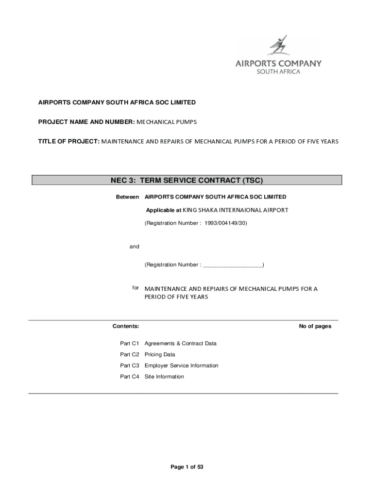 AIRPORTS COMPANY SOUTH AFRICA SOC LIMITED PROJECT NAME AND NUMBER: MECHANICAL PUMPS TITLE OF PROJECT: MAINTENANCE AND REPAIRS OF MECHANICAL PUMPS FOR A PERIOD OF FIVE YEARS NEC 3: TERM SERVICE CONTRACT