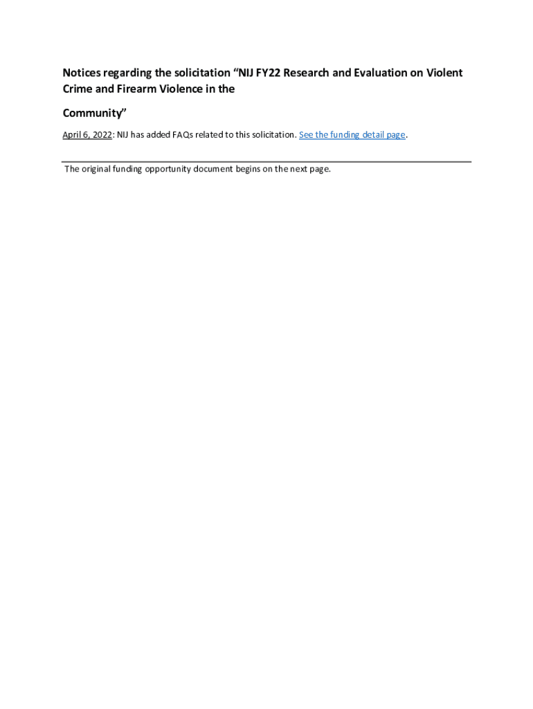 Notices regarding the solicitation NIL FY22 Research and Evaluation on Violent Crime and Firearm Violence in the Community April 6, 2022: NIL has added FAQs related to this solicitation. See the funding