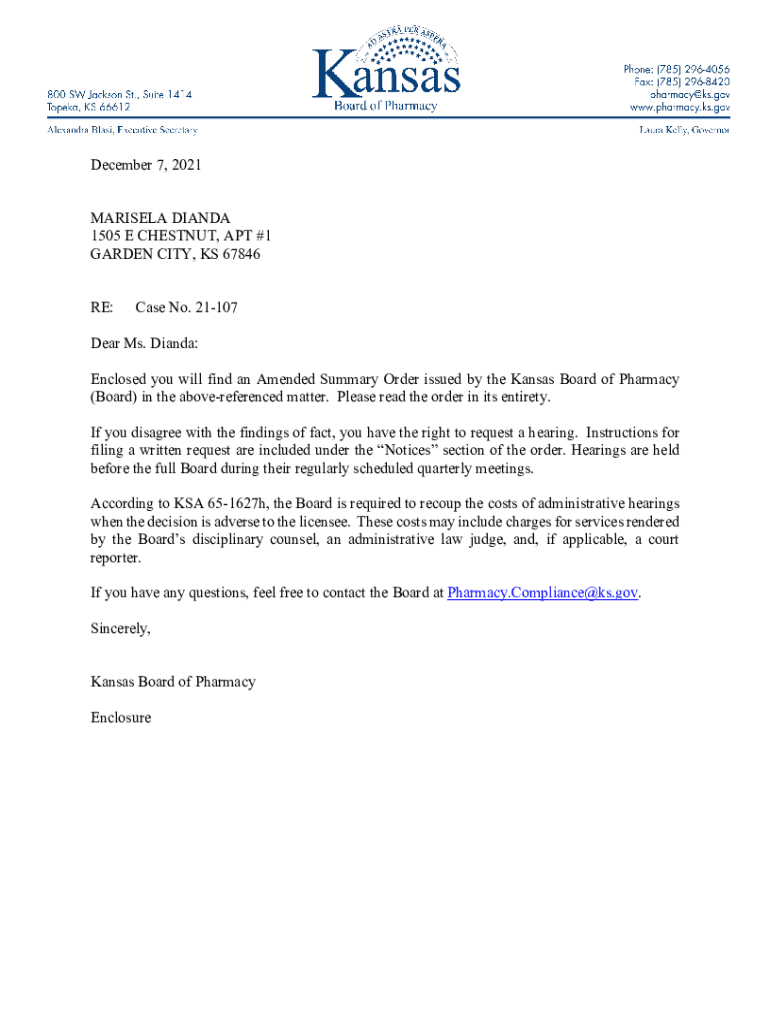 December 7, 2021, MARICELA DIANA 1505 E CHESTNUT, APT #1 GARDEN CITY, KS 67846 RE:Case No. 21107Dear Ms. Diana: Enclosed you will find an Amended Summary Order issued by the Kansas Board of Pharmacy