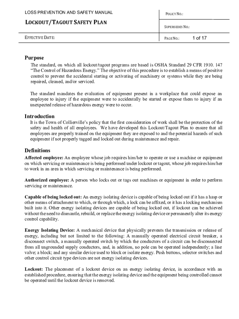 LOSS PREVENTION AND SAFETY MANUALLOCKOUT/RAGOUT SAFETY PLAN EFFECTIVE DATE:POLICY NO.:SUPERSEDES NO.: PAGE NO.:1 of 17Purpose The standard, on which all lockout/ragout programs are based is OSHA Standard
