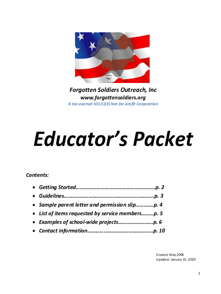 Forgotten Soldiers Outreach, Inc www.forgottensoldiers.org A tax-exempt 501(C)(3) Notforprofit CorporationEducators Packet Contents: Getting Started.p. 2 Guidelines. 3 Sample parent letter and permission