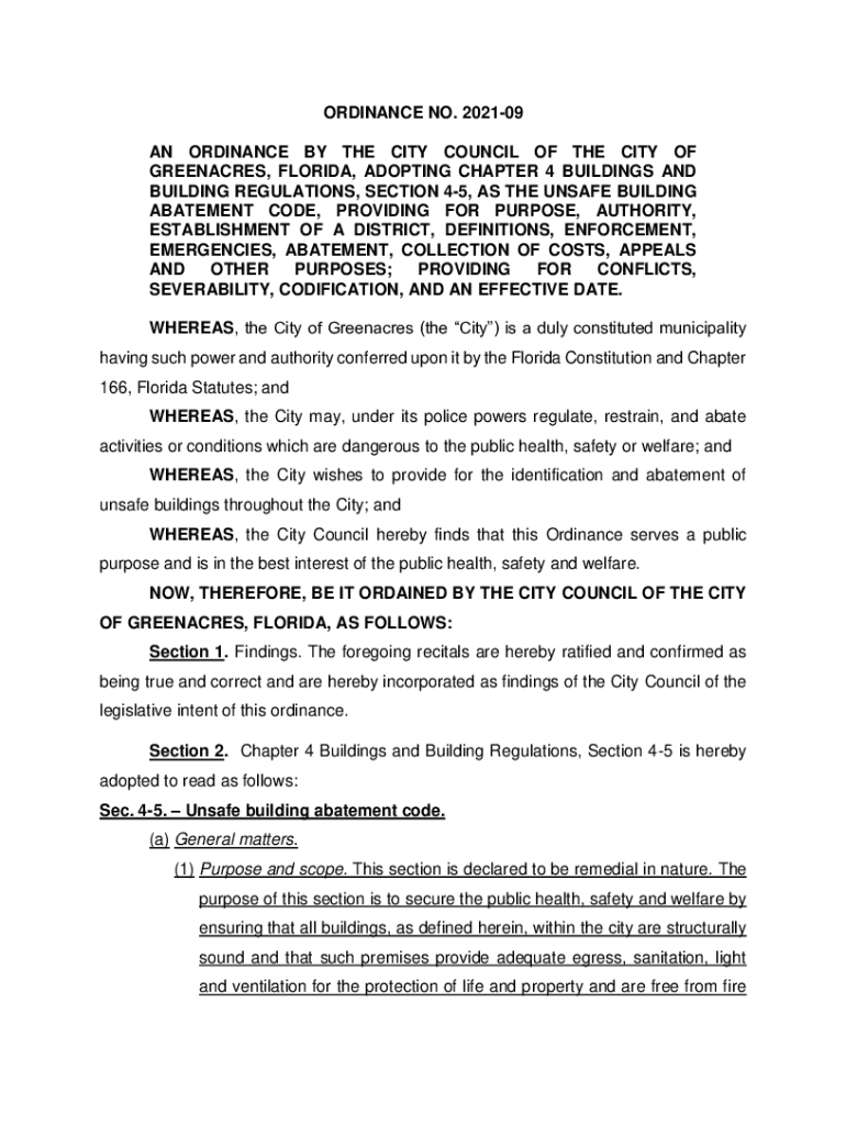 ORDINANCE NO. 202109 AN ORDINANCE BY THE CITY COUNCIL OF THE CITY OF GREENACRES, FLORIDA, ADOPTING CHAPTER 4 BUILDINGS AND BUILDING REGULATIONS, SECTION 45, AS THE UNSAFE BUILDING ABATEMENT CODE,