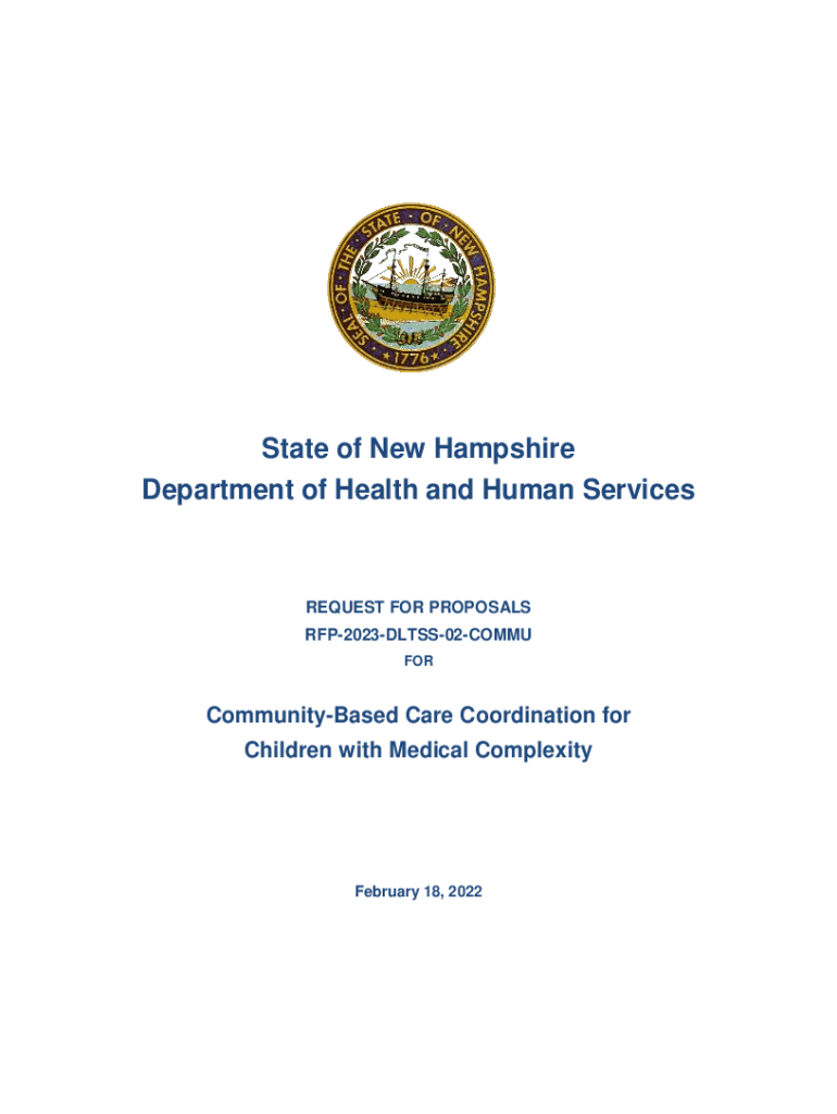 State of New Hampshire Department of Health and Human ServicesREQUEST FOR PROPOSALS RFP2023DLTSS02COMMU FORCommunityBased Care Coordination for Children with Medical Complexity February 18, 2022New