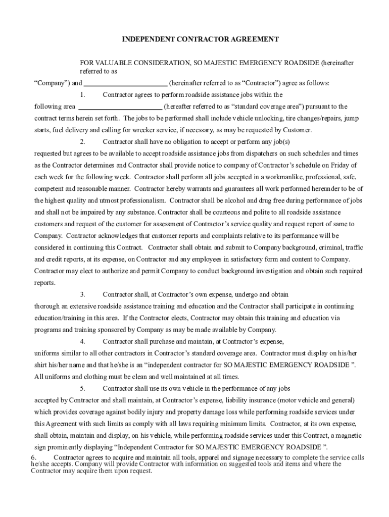 INDEPENDENT CONTRACTOR AGREEMENT FOR VALUABLE CONSIDERATION, SO MAJESTIC EMERGENCY ROADSIDE (hereinafter referred to as Company) and 1. Following area(hereinafter referred to as Contractor) agree