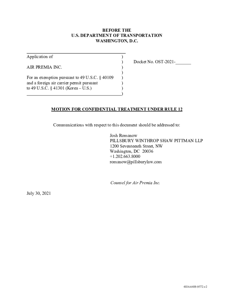 BEFORE THE U.S. DEPARTMENT OF TRANSPORTATION WASHINGTON, D.C. Application of AIR PREMIX INC. For an exemption pursuant to 49 U.S.C. 40109 and a foreign air carrier permit pursuant to 49 U.S.C. 41301