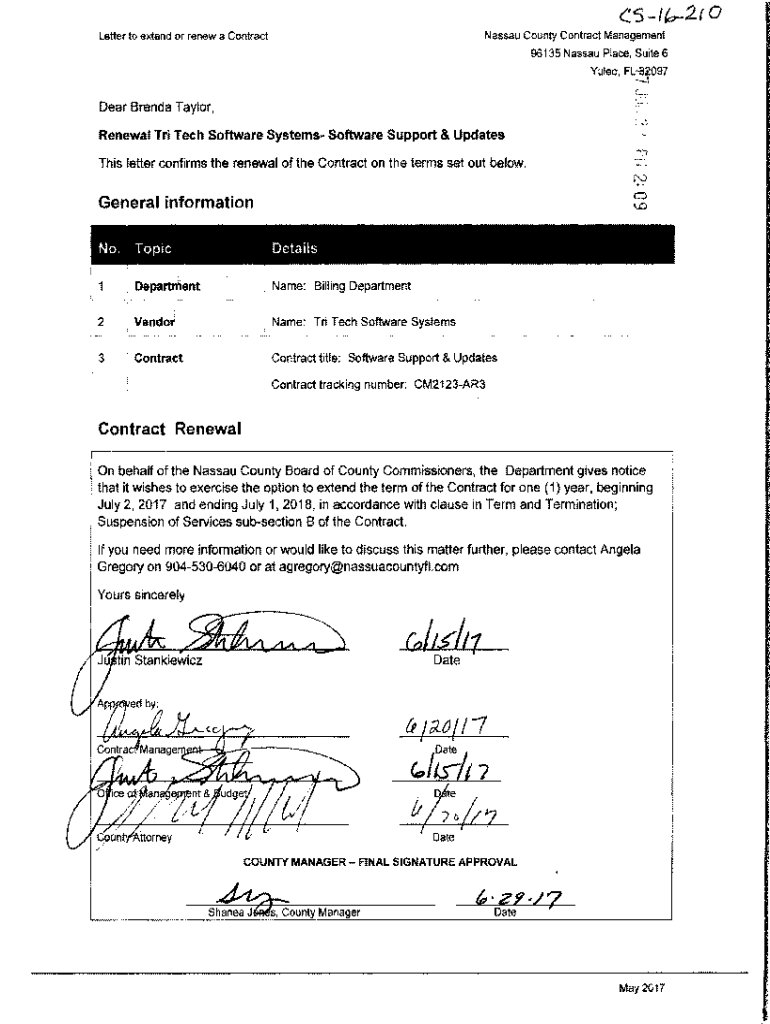 C:.512t0 Nassau County Contract ManagementLetter to extend or renew a Contract96135 Nassau Place, Suite 6 Yule, FL82097 dear Brenda Taylor, : ...) Renewal TRI Tech Software Systems Software Support
