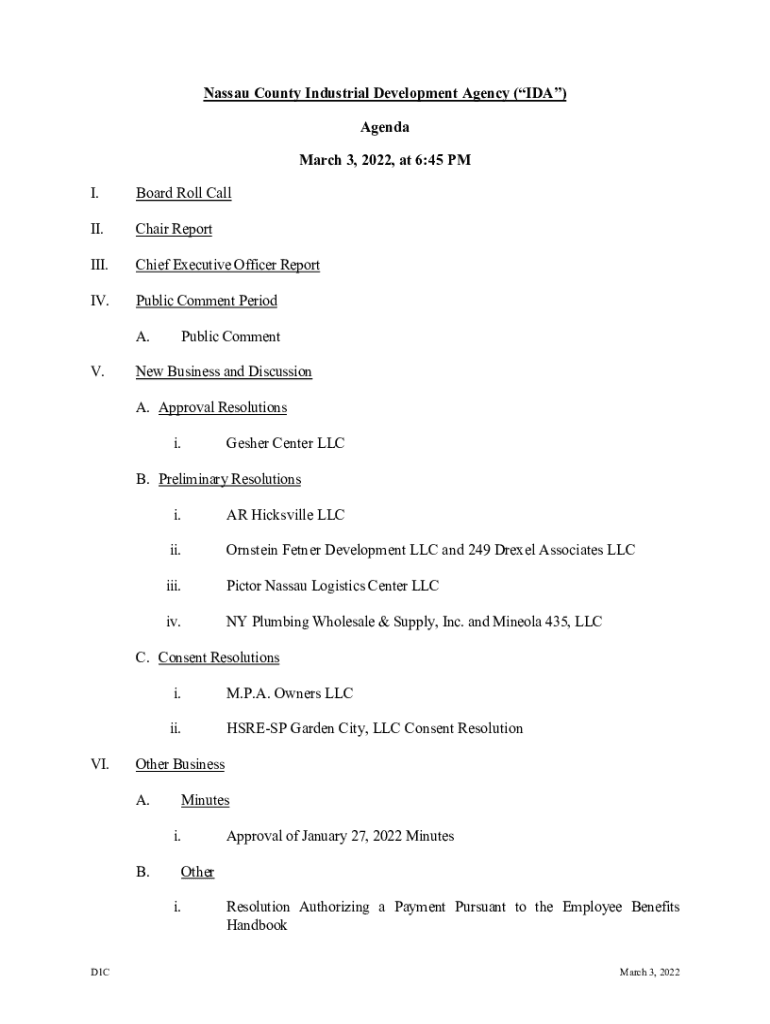 Nassau County Industrial Development Agency (IDA) Agenda March 3, 2022, at 6:45 PM I. Board Roll Callie. Chair Reporting. Chief Executive Officer Report IV. Public Comment Period A.V. Public Commented