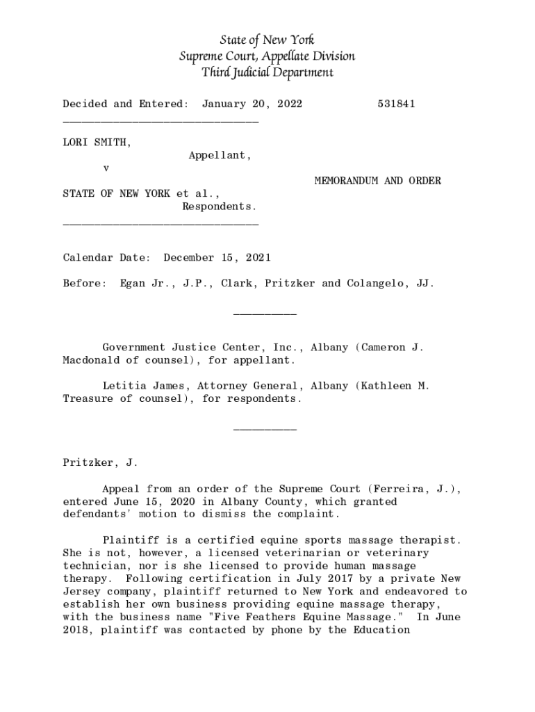 State of New York Supreme Court, Appellate Division Third Judicial Department Decided and Entered: January 20, 2022 ___ LORI SMITH, appellant, STATE OF NEW YORK et al., Respondents. ___ Calendar Date: