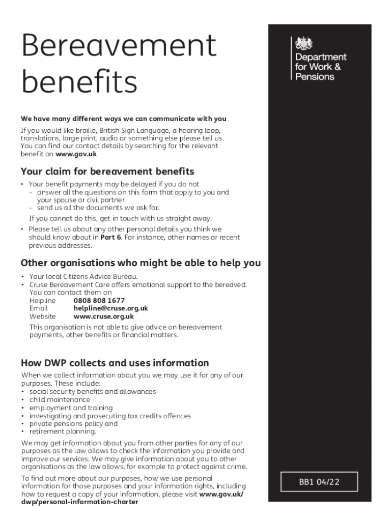 Bereavement benefits We have many ways we can communicate with you If you would like braille, British Sign Language, a hearing loop, translations, large print, audio or something else please tell
