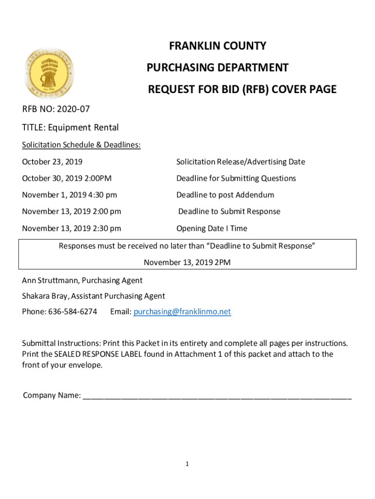 FRANKLIN COUNTY PURCHASING DEPARTMENT REQUEST FOR BID (ROB) COVER PAGE ROB NO: 202007 TITLE: Equipment Rental Solicitation Schedule & Deadlines: October 23, 2019Solicitation Release/Advertising Date