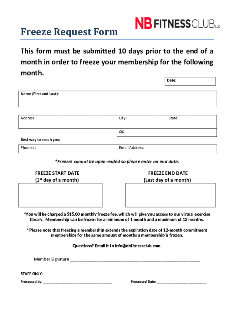 Freeze Request Form This form must be submitted 10 days prior to the end of a month in order to freeze your membership for the following month. Date: Name (First and Last):Address:City:State:Zip: