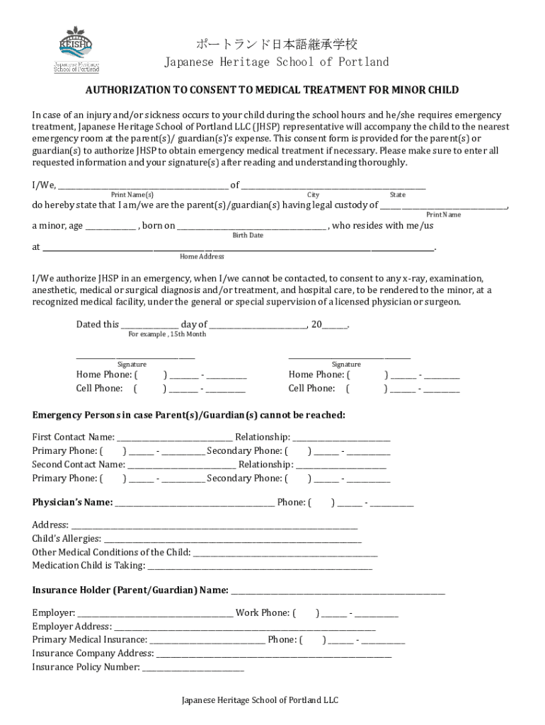 Japanese Heritage School of Portland AUTHORIZATION TO CONSENT TO MEDICAL TREATMENT FOR MINOR CHILD In case of an injury and/or sickness occurs to your child during the school hours and he/she requires