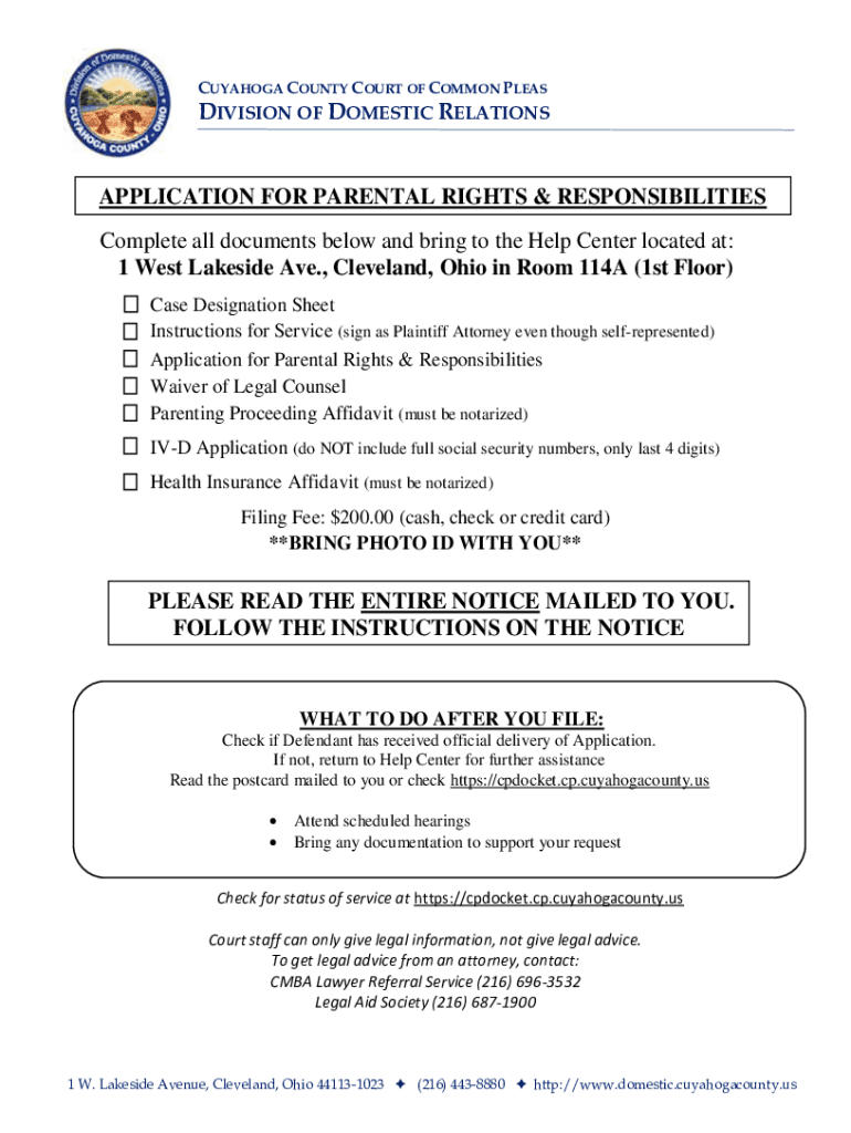 CUYAHOGA COUNTY COURT OF COMMON PLEASDIVISION OF DOMESTIC RELATIONSAPPLICATION FOR PARENTAL RIGHTS & RESPONSIBILITIES Complete all documents below and bring to the Help Center located at: 1 West Lakeside