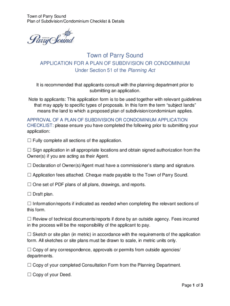 Town of Parry Sound Plan of Subdivision/Condominium Checklist & DetailsTown of Parry Sound APPLICATION FOR A PLAN OF SUBDIVISION OR CONDOMINIUM Under Section 51 of the Planning Act It is recommended