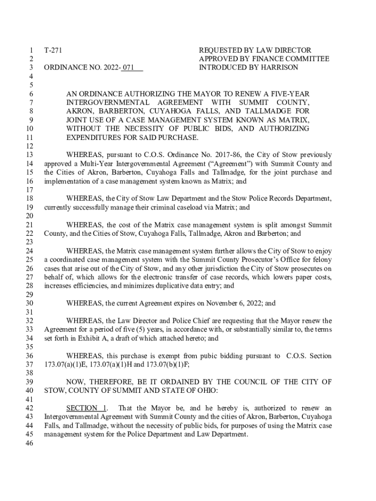 1 2 3 4 5 6 7 8 9 10 11 12 13 14 15 16 17 18 19 20 21 22 23 24 25 26 27 28 29 30 31 32 33 34 35 36 37 38 39 40 41 42 43 44 45 46T271 ORDINANCE NO. 2022 071REQUESTED BY LAW DIRECTOR APPROVED BY FINANCE