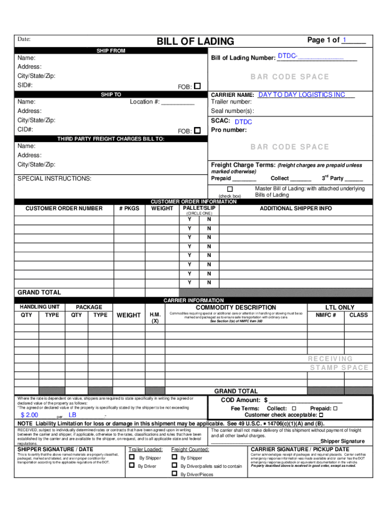 Date:1-Page 1 of ___BILL OF LADING SHIP AROMATIC___ Bill of Lading Number: ___Name: Address: City/State/Zip: SID#:BAR CODE SPACE FOB: CARRIER NAME: ___ DAY TO DAY LOGISTICS INCS HIP Name: Address:Location