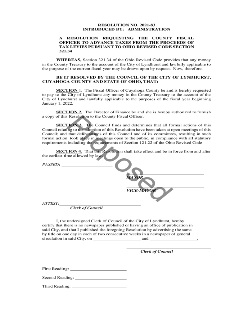 RESOLUTION NO. 202183 INTRODUCED BY: ADMINISTRATION A RESOLUTION REQUESTING THE COUNTY FISCAL OFFICER TO ADVANCE TAXES FROM THE PROCEEDS OF TAX LEVIES PURSUANT TO OHIO REVISED CODE SECTION 321.34