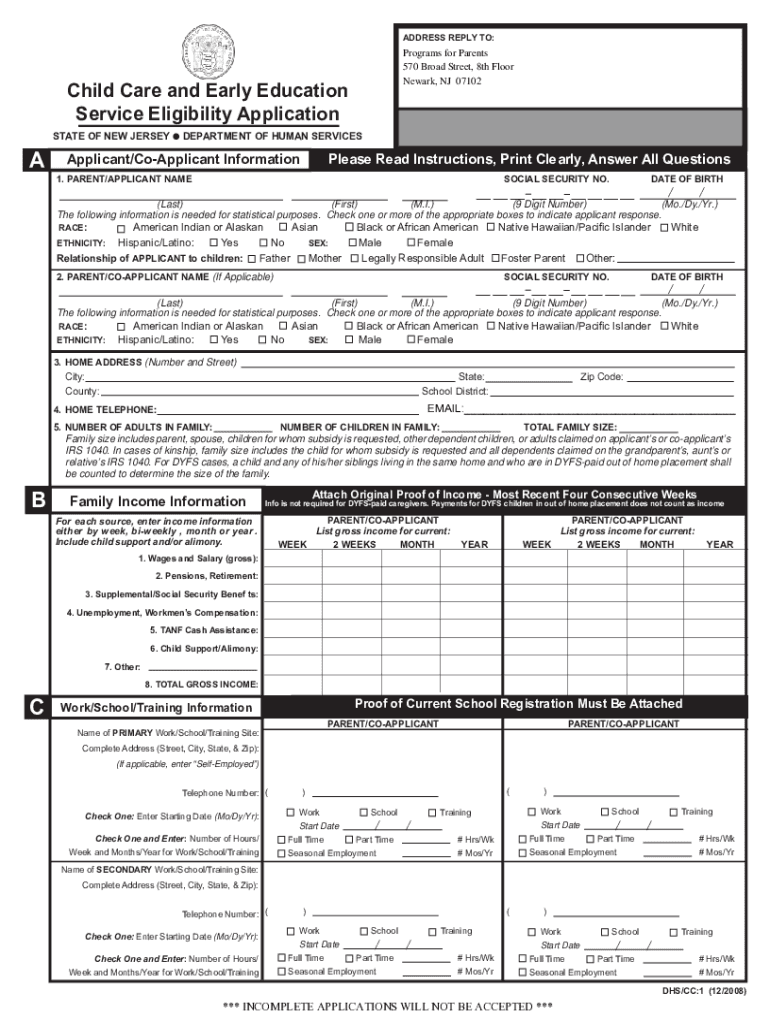 Child Care and Early Education Service Eligibility Application STATE OF NEW JERSEY DEPARTMENT OF HUMAN SERVICESApplicant Instructions for Completing the Child Care Eligibility Form The following instructions