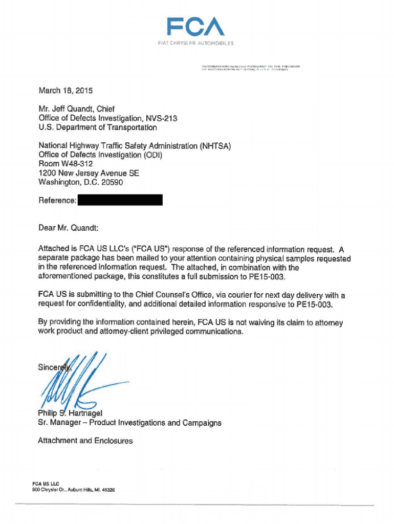 FCA FIAT CHRYSLER AUTOMOBILE SIN F FORMATION fit d4CIQc:I P URDU ANT YO THC f\” A t: t DOM OF I N FOR fV1AT I N A CT (FOIA). 5 u. .c. S5 2(0) (6)March 18 1 2015 Mr. Jeff Quandl, Chief Office of