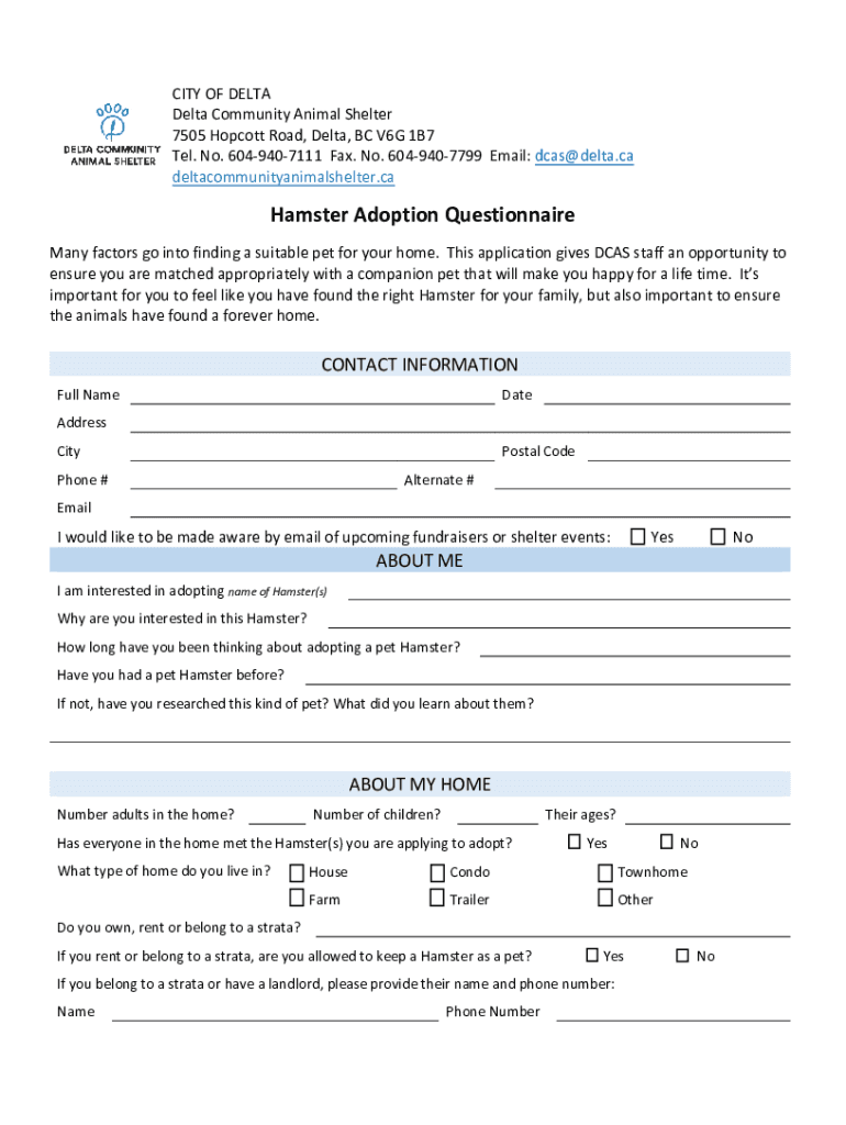 CITY OF DELTA Community Animal Shelter 7505 Boycott Road, Delta, BC V6G 1B7 Tel. No. 6049407111 Fax. No. 6049407799 Email: dcas@delta.ca deltacommunityanimalshelter. Hamster Adoption Questionnaire