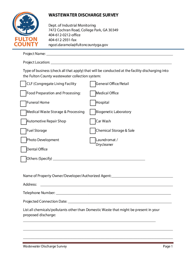 WASTEWATER DISCHARGE SURVEY Dept. of Industrial Monitoring 7472 Cochran Road, College Park, GA 30349 4046120212office 4046122931fax ngozi.daramola@fultoncountyga.gov Project Name: ___ Project Location: