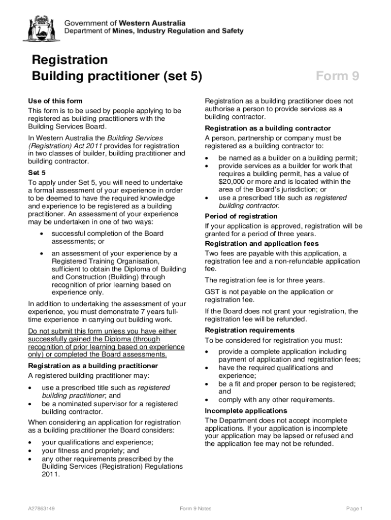 Registration Building practitioner (set 5) Use of this form is to be used by people applying to be registered as building practitioners with the Building Services Board. In Western Australia the Building