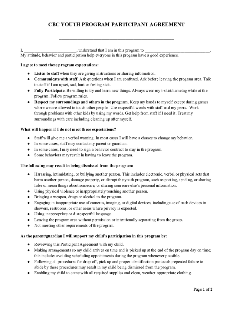 CBC YOUTH PROGRAM PARTICIPANT AGREEMENT ___ I, ___, understand that I am in this program to ___. My attitude, behavior and participation help everyone in this program have a good experience. I agree