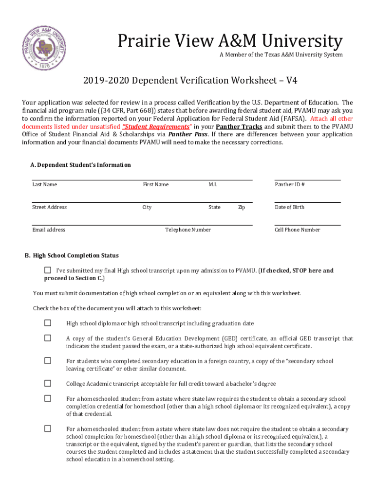 Prairie View A&M University A Member of the Texas A&M University System20192020 Dependent Verification Worksheet V4 Your application was selected for review in a process called Verification by the