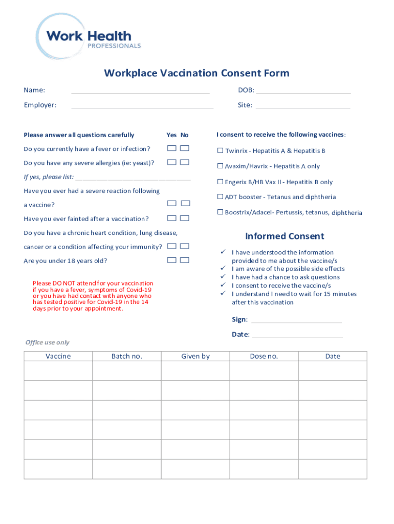 Workplace Vaccination Consent Form Name:___DOB: ___Employer:___Site: ___Please answer all questions carefully NOI consent to receive Yes the No following vaccines:Do you currently have a fever or