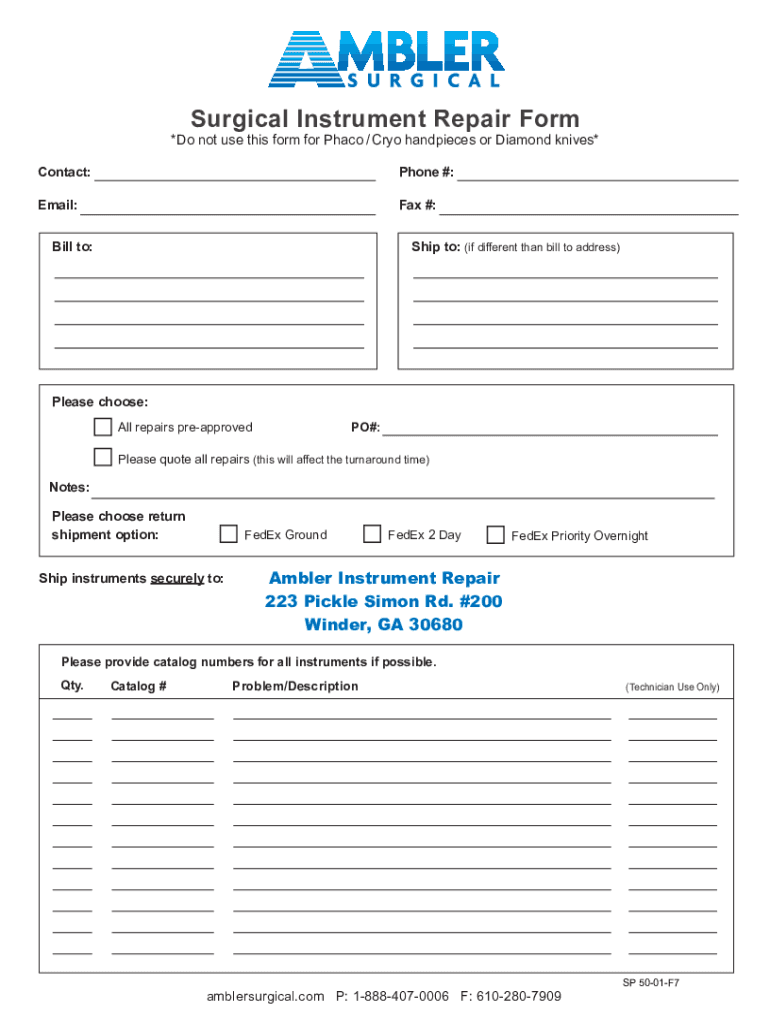 Surgical Instrument Repair Form×Do not use this form for Place / Cry hand pieces or Diamond knives* Contact:Phone #:Email:Fax #:Bill to:Ship to: (if different from bill to address)Please choose: