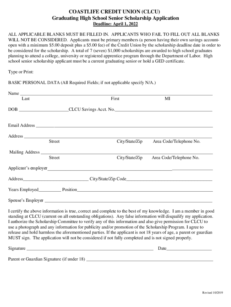 COASTLINE CREDIT UNION (CCU) Graduating from High School Senior Scholarship Application Deadline: April 1, 2022, ALL APPLICABLE BLANKS MUST BE FILLED IN. APPLICANTS WHO Fail TO FILL OUT ALL BLANKS