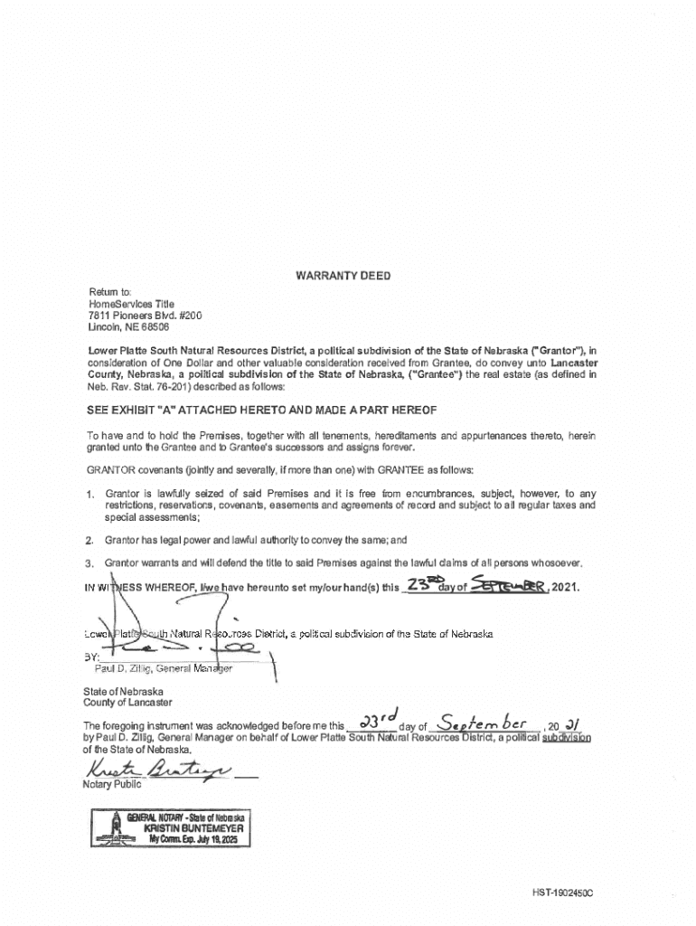 WARRANTY DEED Return to: HomeServices Title 7811 Pioneers Blvd. #200 Lincoln, NE 68506 Lower Platte South Natural Resources District, a political subdivision of the State of Nebraska (\” Granter\”),