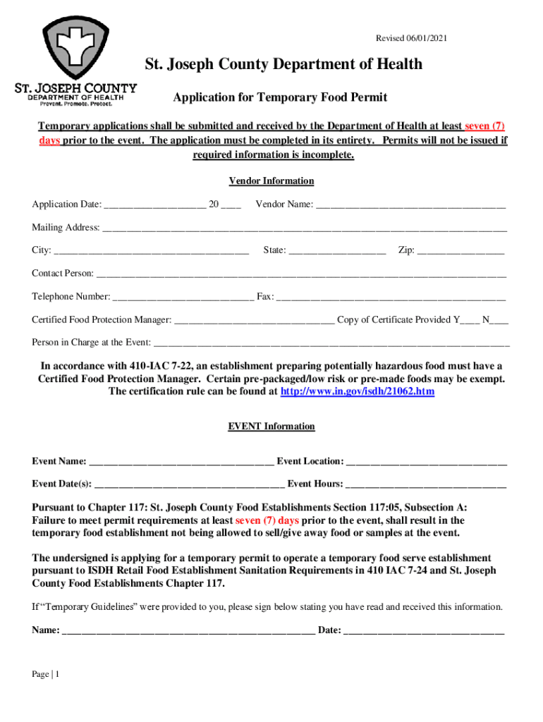 Revised 06/01/2021St. Joseph County Department of Health Application for Temporary Food Permit Temporary applications shall be submitted and received by the Department of Health at least seven (7)