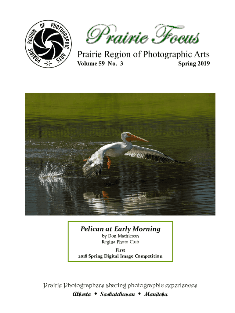 Prairie Region of Photographic Arts Volume 59 No. 3Spring 2019Pelican at Early Morning by Don Matheson Regina Photo Club First 2018SpringDigitalImageCompetitionPrairie Photographers sharing photographic